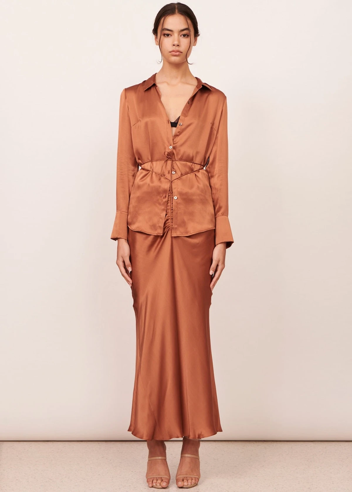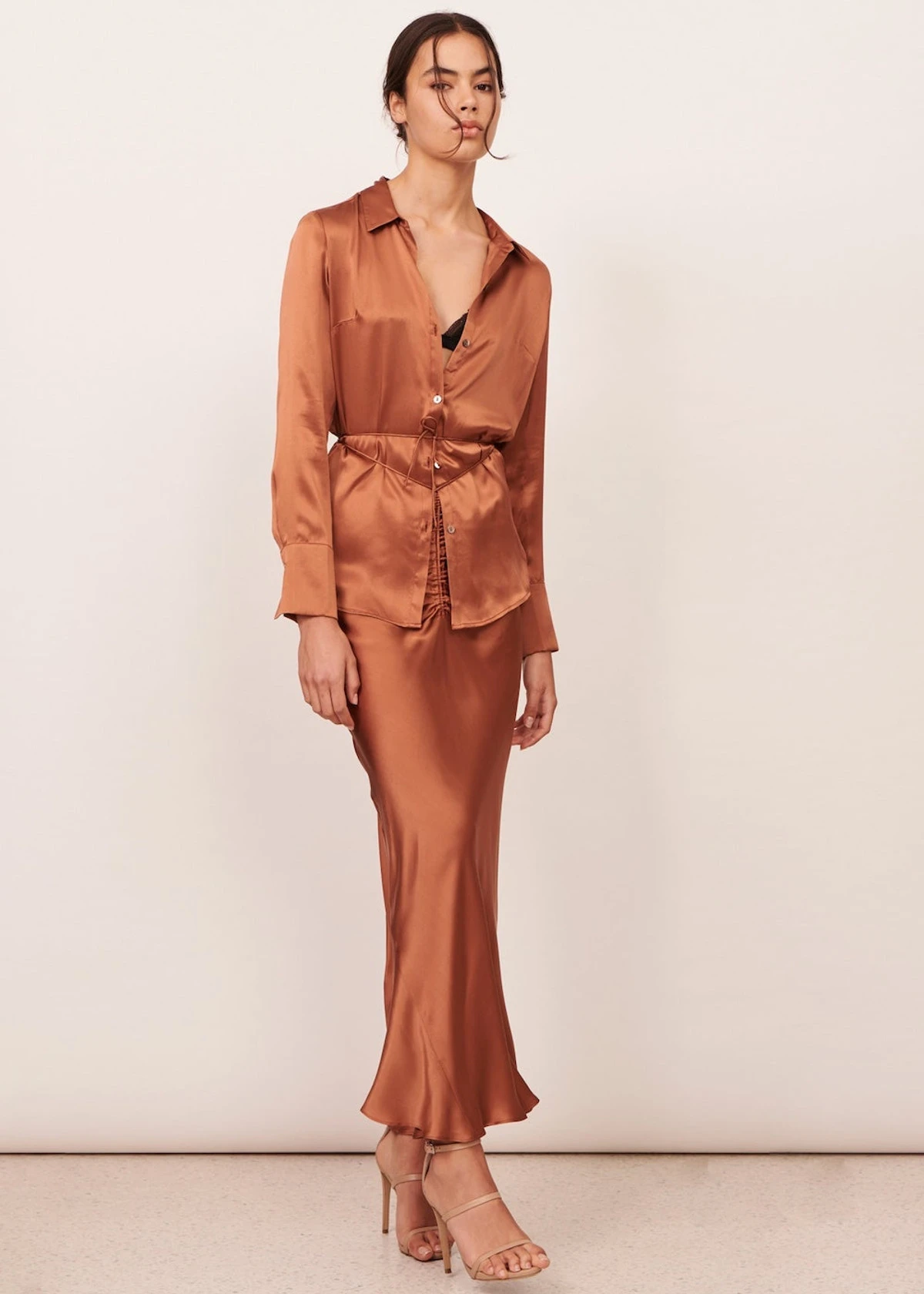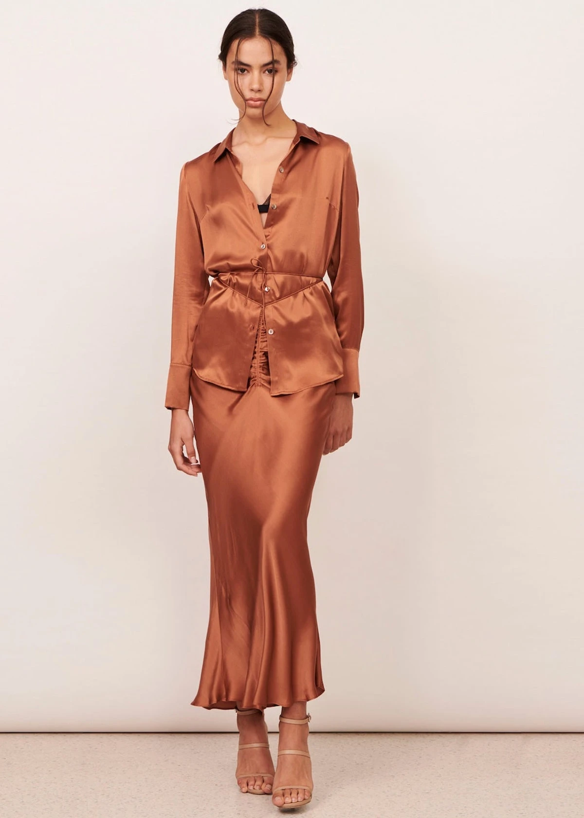 The Valerie Satin Skirt is a beautiful, timeless piece made of silk. Its drawcord waist creates an effortless, elegant gathered ruched detail. Try styling it back with the Valerie Silk Shirt in the matching colour, or wear with the Delphine Silk Organdie Shirt.