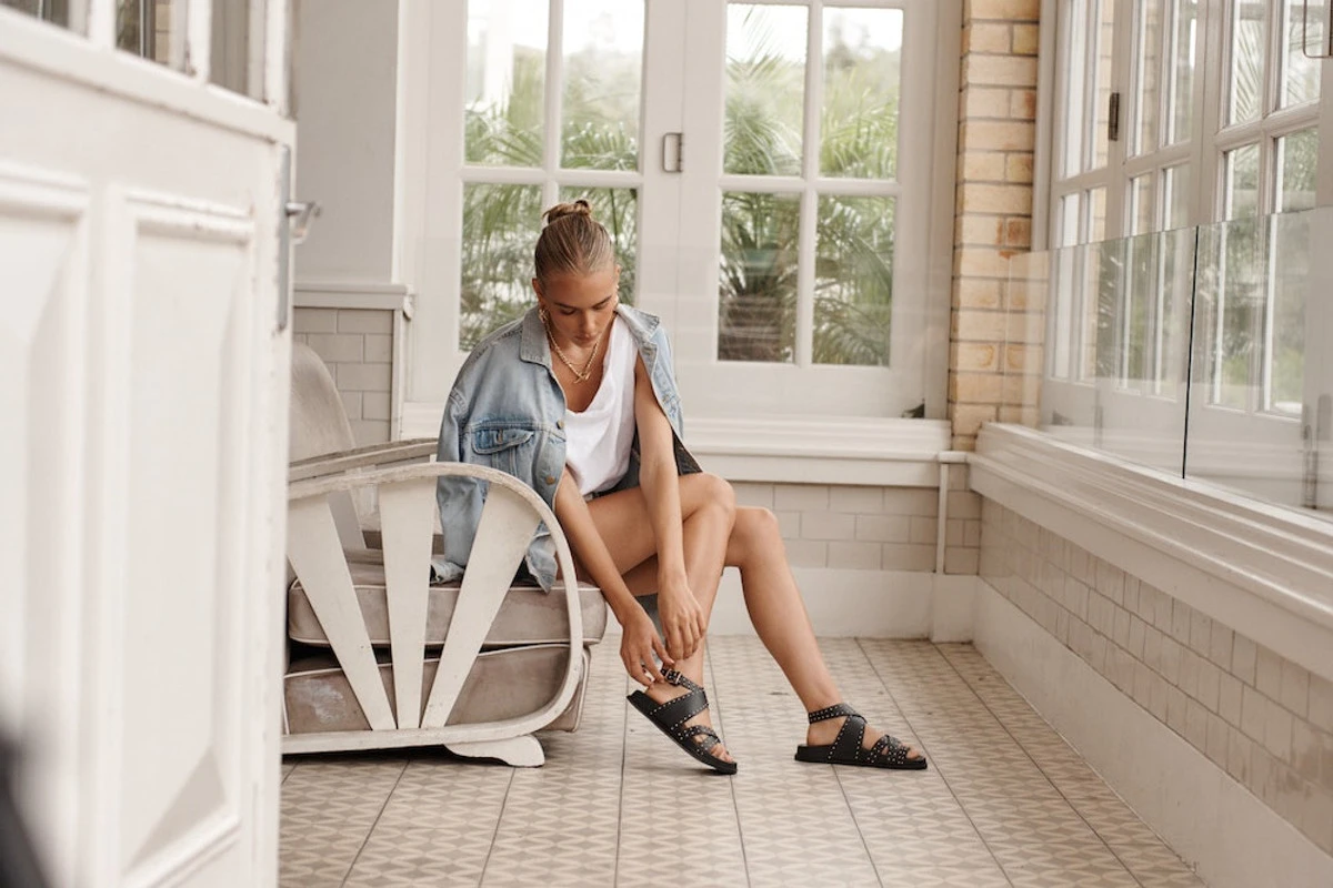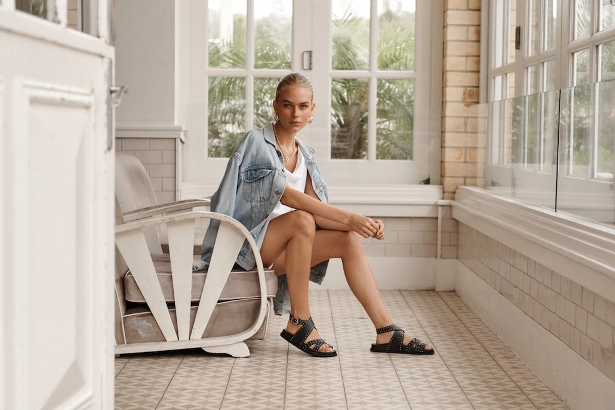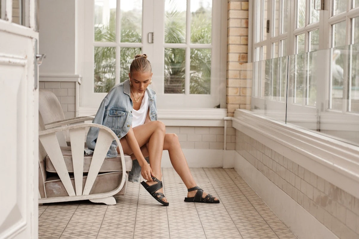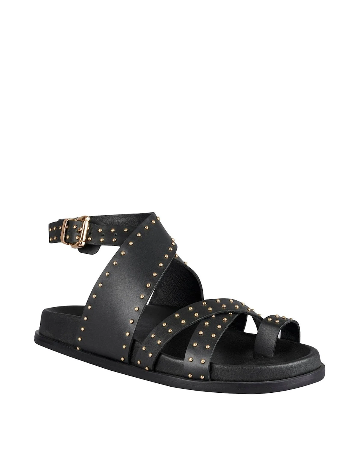 Sol Sana’s distinctive hardware studs outline a contemporary interpretation of the strappy sandal. The bestselling Vesper slide has been reworked with a luxury footbed for extra comfort. Broad bands of supple leather intricately cross the foot, encircle the toe, and extend to secure behind the ankle. The Vesper sandal stands out as a sophisticated summer favourite.