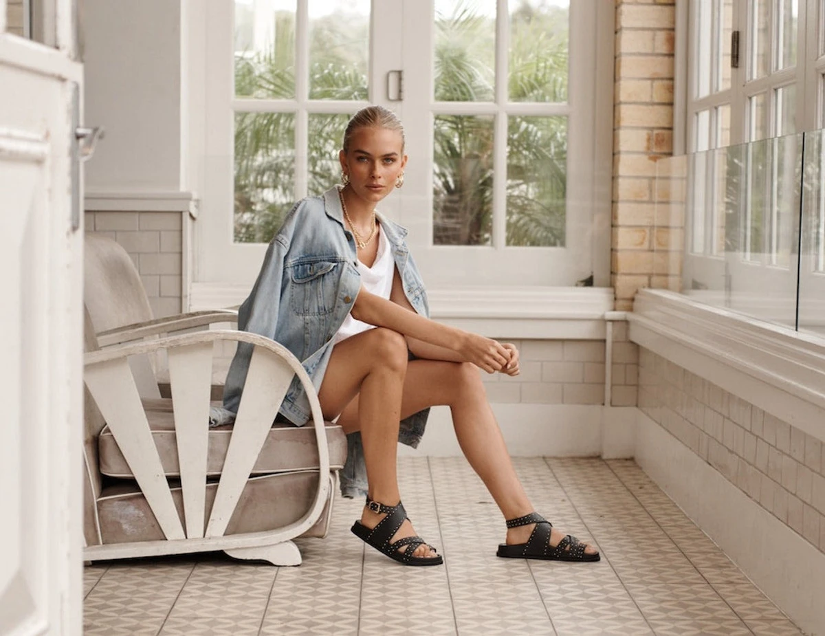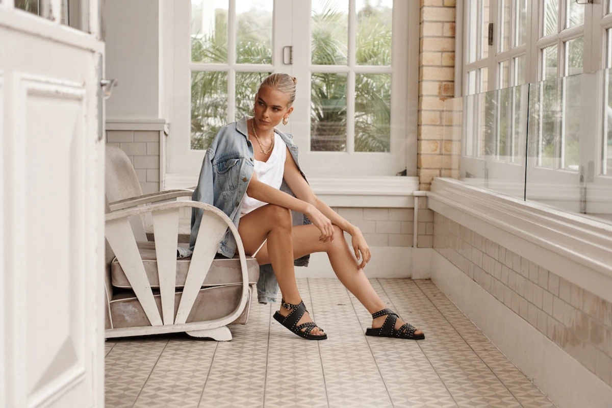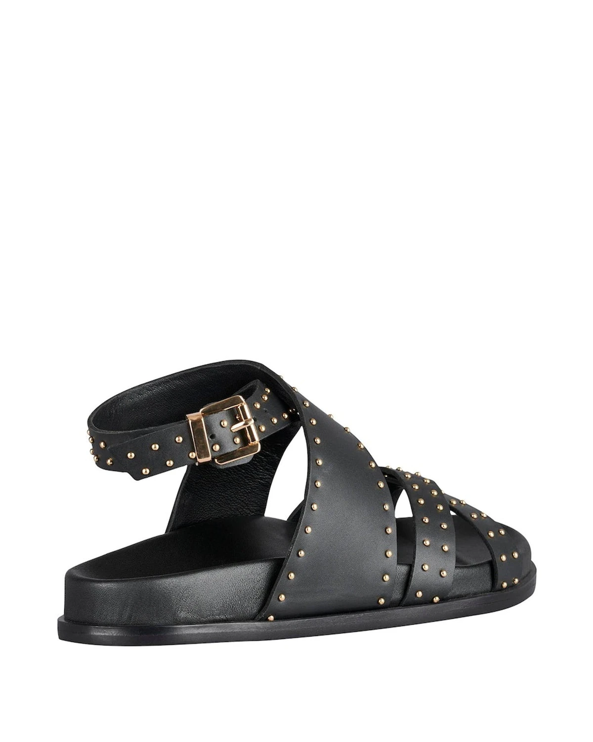 Sol Sana’s distinctive hardware studs outline a contemporary interpretation of the strappy sandal. The bestselling Vesper slide has been reworked with a luxury footbed for extra comfort. Broad bands of supple leather intricately cross the foot, encircle the toe, and extend to secure behind the ankle. The Vesper sandal stands out as a sophisticated summer favourite.